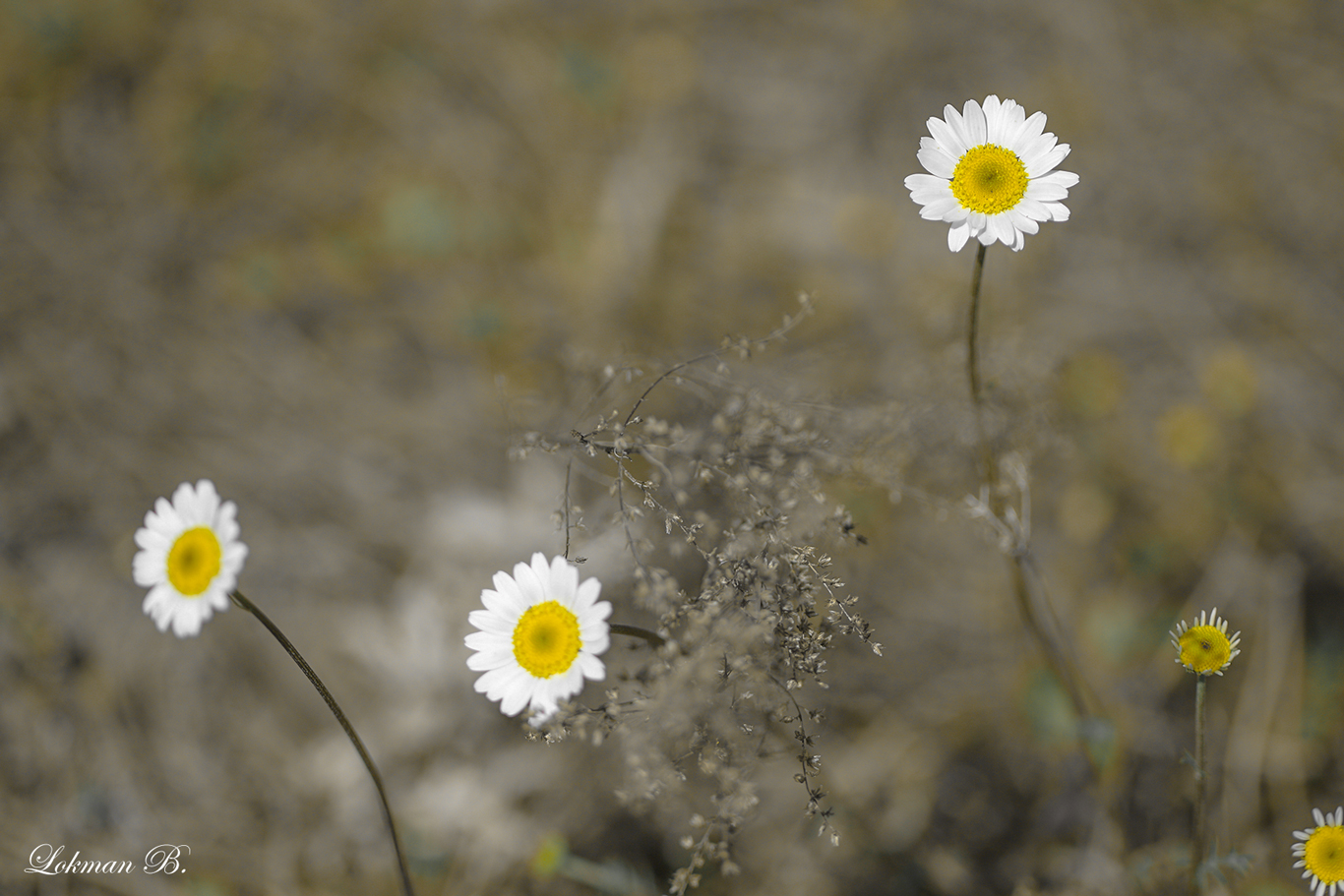 Arazi hallerinden. 3 papatya kendi hallerinde duruyordu, aralarına kuru otlar karışmış...