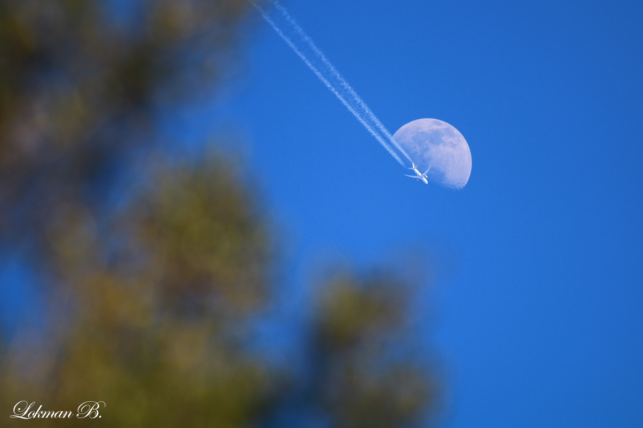 Kelebek arazisinde geziniyordum. Dikkatimi Ay çekti, ağaç dallarının arkasından çok güzel görünüyor. Bir iki kare fotoğraf aldıktan sonra baktım uçak Ay'ın hizası ile aynı doğrultuda ilerliyor. Acaba dedim geçer mi önünden? Tam da istediğim gibi oldu. Benim hoşuma gitti, umarım izleyenler de beğenir...